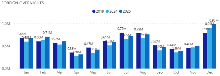 Kuva: Ulkomaiset yöpymiset majoitusliikkeissä vuosina 2019 sekä 2024-2025. Tilastopalvelu Rudolf Power BI -raportti.
