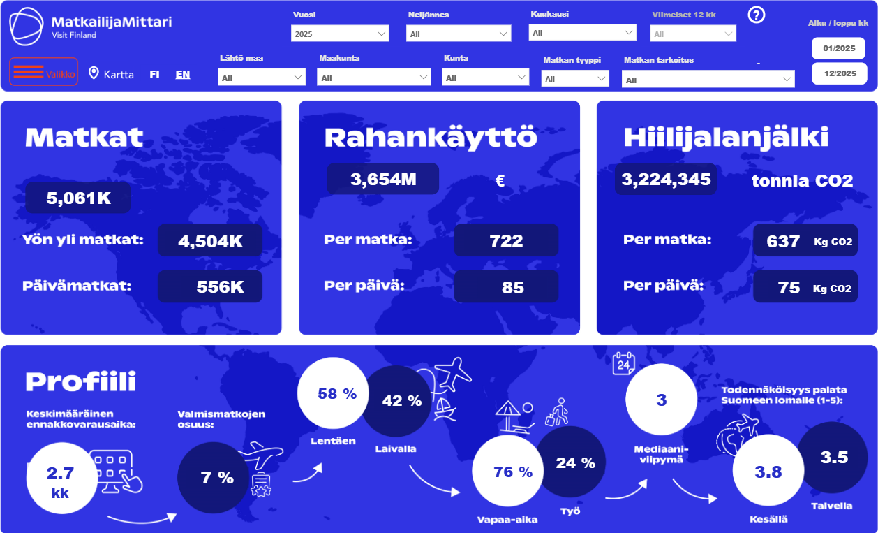 Kuva: Ulkomainen matkailu Suomeen vuoden 2025 aikana, Matkailijamittari Power BI -raportti.