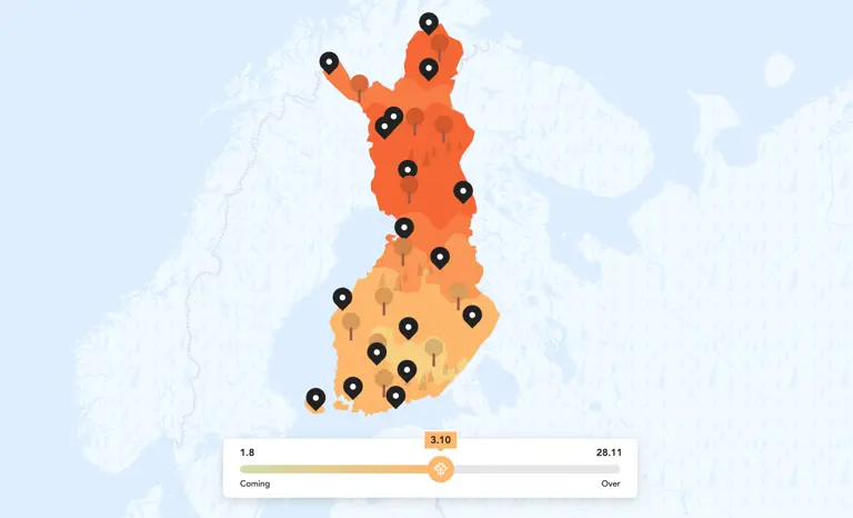 – Ruskatilannetta ennustetaan tekoälyn avulla ja tulokset viedään helppokäyttöiseen karttanäkymään. Palvelu hyödyntää mm. koko Suomen alueelta kerättyä tiekamera-aineistoa havaitakseen ruskan etenemisen syyskauden aikana. Tekoäly prosessoi ja jalostaa kerätyistä kuvista informaation, yhdistää sen säätilasta saatavaan tietoon ja luo näkymän ruskan vaiheista aina Hangosta Enontekiöön saakka, Visit Finlandin digitaalisen markkinoinnin asiantuntija Minna Myyrinmaa kertoo.