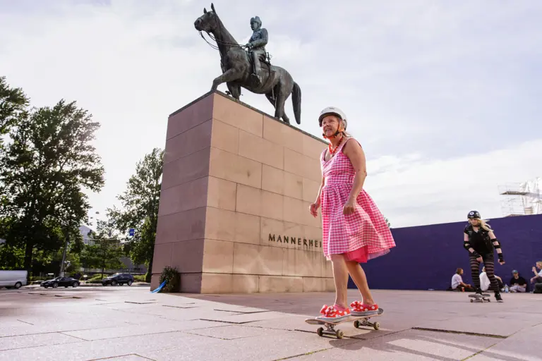 Skeittimummo opettaa suomalaista onnellisuutta kansainvälisille matkailijoille Helsingissä