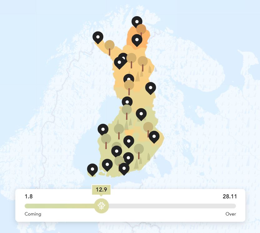 Tekoälyalgoritmi kertoo kartalla, miten ruska on edennyt Suomessa.