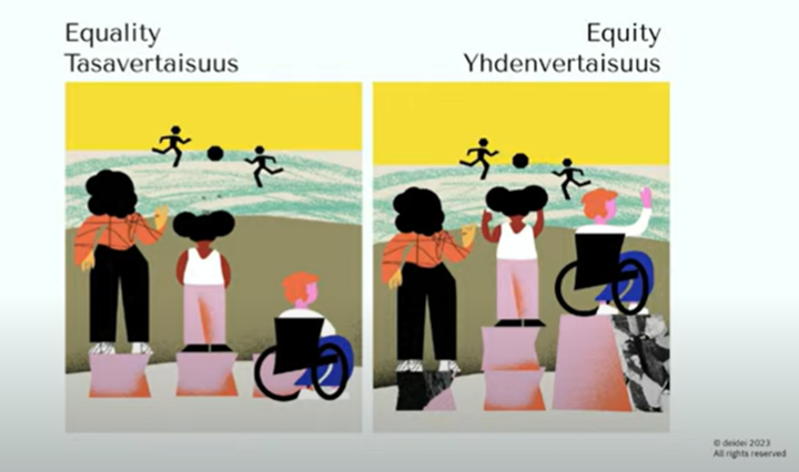 – Tasavertaisuus on sitä, että kaikille tarjotaan samat työkalut vaikkapa näköalan katselemiseen, kun taas yhdenvertaisuus huomioi eri kohderyhmien erilaiset tarpeet, selvensi seminaarin juontaja, deidei-asiantuntijatoimiston sekä Jäbät ja tunteet -yhteisön perustaja Nasim Selmani puheenvuorossaan.