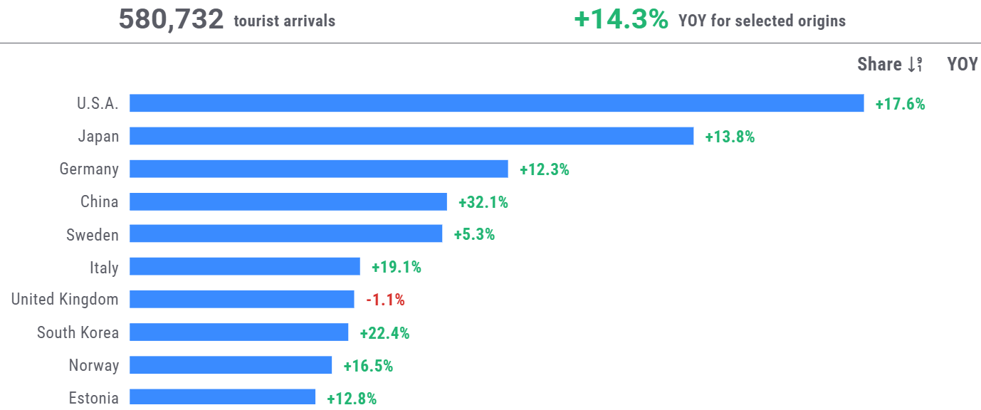 Kuva: Ulkomainen matkailu Suomeen viimeisen 12 kuukauden aikana, Matkailijamittari Power BI -raportti.