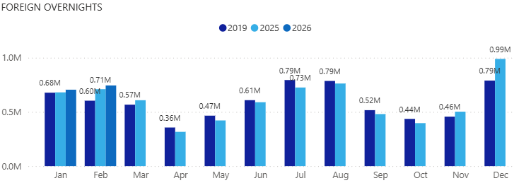 Kuva: Ulkomaiset yöpymiset majoitusliikkeissä vuosina 2019 sekä 2025-2026. Tilastopalvelu Rudolf Power BI -raportti.